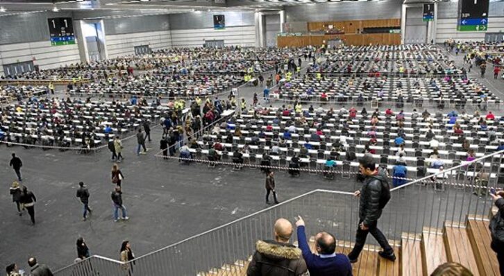 El recinto ferial del BEC apenas fue capaz de acoger a las decenas de miles de personas que acudieron ayer a participar en la Oferta Pública de Empleo de Osakidetza. Ayer fue el turno de las pruebas para Celador y Auxiliar Administrativo, y hoy les tocará a los aspirantes de Enfermería y Auxiliar de Enfermería.