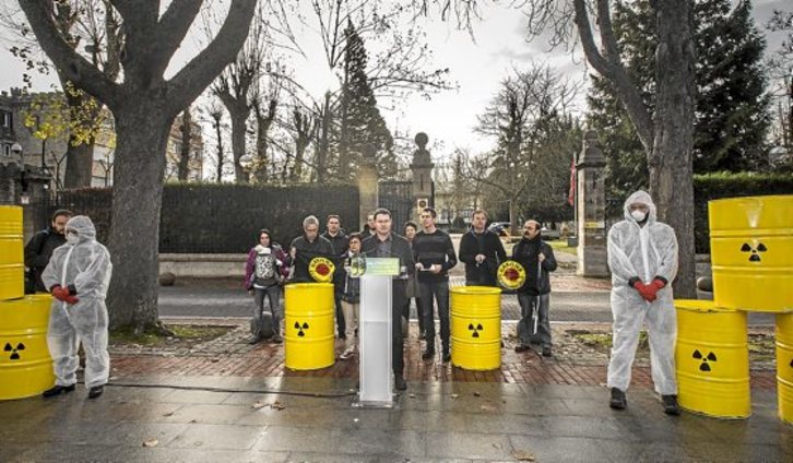 EH Bildu celebró ayer un acto simbólico ante la Delegación del Gobierno español para reivindicar el cierre definitivo de Garoña. «Hemos venido aquí, a la casa del embajador Carlos Urquijo, para solicitar el cierre definitivo de Garoña y denunciar la voluntad del Gobierno del PP de reabrir la central nuclear», afirmó Urbina.