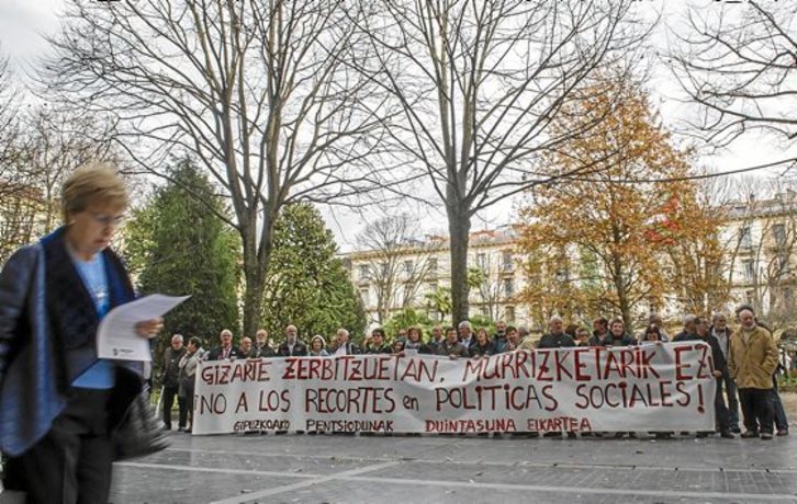 Los miembros de Duintasuna se concentraron ayer frente al Palacio Foral para pedir a la Diputación que incremente las partidas sociales, en lugar de invertir en la incineradora y en el Metro de Donostialdea.