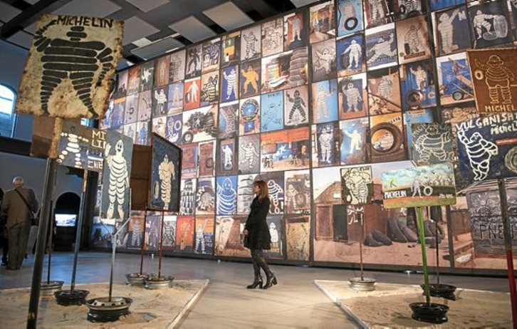 La Alhóndiga acoge la exposición «Liñiou Faté», en la que se retratan las diferentes representaciones del hombre rueda «Michelín», en los talleres mecánicos de África del artista Juan Mari Indo.