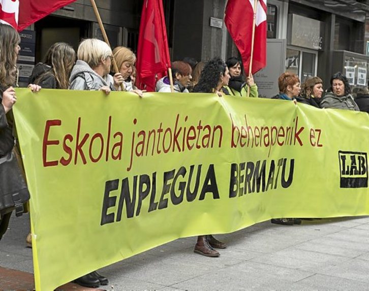 Representantes de LAB se concentraron ayer ante la delegación del Gobierno de Lakua en Bilbo para advertir de que «han llegado las rebajas» a las adjudicaciones de comedores escolares, cuyo proceso ha concluido «con un final nada convincente para los trabajadores ni para un buen servicio de calidad».