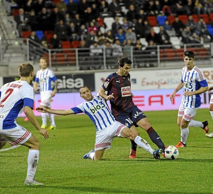 Cuatro temporadas que, contra todo pronóstico, se consumieron en Segunda B. Y con altibajos para el delantero que, siempre criticado por parte de la grada, incluso tuvo que salir en busca de aire fresco. Permaneció un año en Leganés, también en Segunda B, y curiosamente fue su curso más fructífero. Anotó 21 goles y regresó a casa para protagonizar la mejor etapa en la historia del Eibar. Protagonizarla como actor principal porque a partir de ese momento fue un jugador indiscutible, tanto para Javier Mandiola como para Gaizka Garitano. Con el eibarrés vivió su enésimo play-off frustrado; con el vizcaino, alcanzó la gloria. En el último curso en Segunda B lo jugó prácticamente todo y marcó 16 goles, incluyendo el penalti transformado en San Mamés que permitió al Eibar superar al Athletic en Copa. Nada cambió en Segunda A: titular indiscutible, siete goles, otro final feliz y una grada ya totalmente, o casi, entregada al tolosarra.