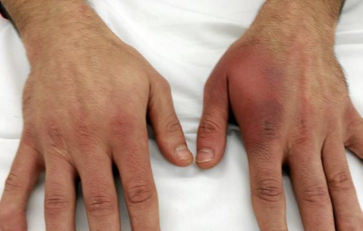El parte médico ofrecido por Aspe, acompañado por la fotografía que acompaña esta información, habla de que se «aprecia dolor a la palpación en la eminencia tenar acompañado de inflamación y un hematoma subcutáneo en la cara palmar y dorsal de la mano», por lo que está siendo «tratado con tecarterapia, drenaje manual y antiinflamatorios por vía oral».