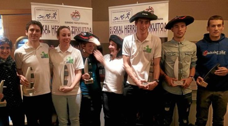 Ayer se celebró en Irun la fiesta del triatlón y duatlón de Euskal Herria. Cuando se ha cumplido el sexto año del circuito que trata de aunar los cuatro herrialdes de Hego Euskal Herria los más destacados de 2015 fueron la guipuzcoana Lourdes Oiartzabal, del Antxintxika Servimasa T.T., y el navarro Iñigo Arregi, del C.D Erreka KE, en duatlón, y la alavesa Ibone Sánchez, del Urola T.K., y el alavés Urko Herran, del Araba-Tri en triatlón.ETF