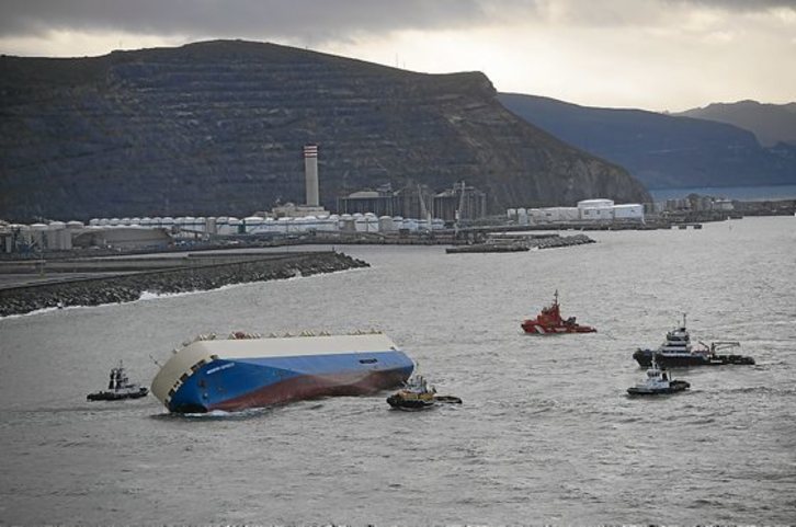 El buque Modern Express entró ayer en el Puerto de Bilbo. Según informó Europa Press, el buque, que transporta maquinaria de obra pública y madera, sufrió una fuerte escora y quedó a la deriva el pasado 26 de enero. Sus 22 tripulantes fueron evacuados por Salvamento Marítimo.Luis JAUREGIALTZO | ARGAZKI PRESS