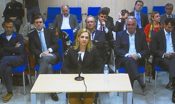 Cristina de Borbón es la primera integrante de la familia real española en sentarse en el banquillo de los acusados. Ayer declaró ante el tribunal que juzga el «caso Nóos» en relación a dos delitos fiscales cometidos por la sociedad Aizoon que tiene al 50% con su esposo, Iñaki Urdangarin, y por los que se enfrenta a una petición de ocho años de cárcel. En su declaración de 66 minutos, la hermana del rey español aseguró que accedió a formar parte de Aizoon «por confianza» en su marido, que previamente intentó excluirla de toda responsabilidad, y defendió que nunca fue «escudo fiscal» ante Hacienda ni figuró en Aizoon para obtener beneficios tributarios.