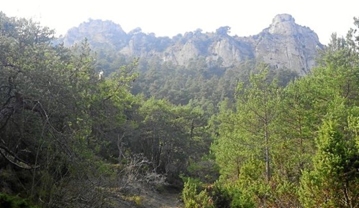 Veremos dirección sur un deposito de aguas, nos dirigiremos a él por medio de la evidente y única pista que nos encontraremos. A la izquierda del depósito de aguas nace una pista que cogeremos. Pronto dicha pista tuerce a la derecha y se pone dirección oeste. Está marcada con señales blanco-rojas del GR, así que no tendréis problemas en identificarla. Avanzaremos por ella durante 5 minutos hasta que veamos un riachuelo a nuestra izquierda. Tendremos dos opciones, podríamos seguir por la pista y en el siguiente cruce torcer a la izquierda para seguir subiendo o también podríamos abandonar la pista y subir, campo a través, paralelos al riachuelo. Si elegimos la segunda opción, aunque es más complicada, pasaremos por al lado de una poza bastante chula. Un poco más adelante, saldríamos de nuevo a la pista de antes.