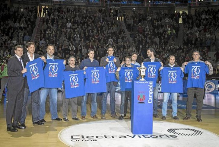 No por esperado fue un momento menos emocionante. Antes de empezar el derbi, la plantilla del Taugrés Baskonia ganadora de la Recopa de 1996 y Oriol Comas, hijo del técnico fallecido Manel Comas, recibía la reverencia y ovación de un Buesa Arena puesto en pie.Jaizki FONTANEDA | ARP
