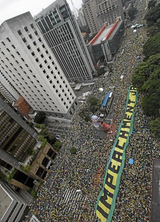 Con el grito de «Fuera Dilma», la oposición a la presidenta de Brasil llevó a cabo ayer manifestaciones en todo el país para reclamar la salida del poder de Dilma Rousseff, envuelta en una grave crisis política. Las imágenes aéreas de Sao Paulo y Rio de Janeiro mostraban grandes multitudes. Según la Policía militar, en Brasilia se concentraron hasta 100.000 personas frente al Congreso, en la Explanada de los Ministerios. La Policía no dio cifras sobre la participación en Río, donde los organizadores hablaban de entre 700.000 y un millón de personas.