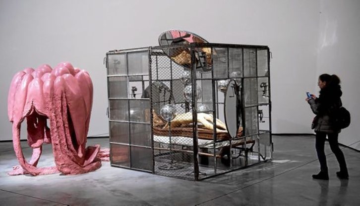 Junto a las celdas, en las que conviven objetos “brutales” como piernas amputadas, una guillotina, una silla eléctrica, prótesis, objetos para triturar carne, pieles de conejo, con delicados bordados hechos por ella misma, la exposición muestra también como si se tratara de un gabinete de las maravillas, una selección de piezas fechadas entre 1943 a 2010. Y, en mitad del recorrido, en la pequeña capilla desde la que se contempla la gran escultura de Richard Serra, “La destrucción del padre”.