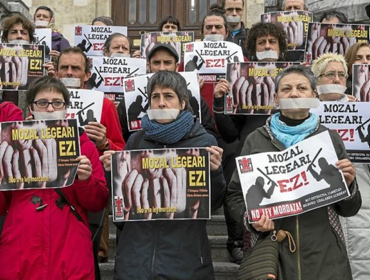 Un grupo de personas sancionadas administrativamente por participar en movilizaciones sociales de protesta se concentraron ayer en Bilbo para denunciar la aplicación de la Ley de Seguridad Ciudadana, más conocida como la «Ley Mordaza».