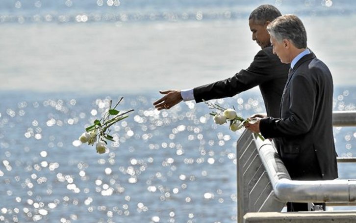 El presidente de EEUU, Barack Obama, rindió ayer homenaje a las víctimas de la dictadura argentina, coincidiendo con el 40 aniversario del golpe de Estado que instauró la última dictadura militar, entre 1976 y 1983. «Que se cumpla la promesa» del «nunca más», reclamó Obama durante su visita, acompañado de su homólogo argentino, Mauricio Macri, al Parque de la Memoria, erigido frente al río de La Plata, y que fue criticada por alguna organización de derechos humanos. Ambos arrojaron flores blancas a sus aguas en señal de respeto a las víctimas del «terrorismo de Estado».