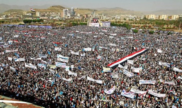 Ayer, decenas de miles de personas protestaron en la capital, en una manifestación en la que apareció en público, por primera vez en un año, el expresidente Saleh. En un breve discurso, el exmandatario pidió un «diálogo directo» con Arabia Saudí para terminar la guerra, y acusó al Consejo de Seguridad de la ONU de «no mover un dedo» por Yemen. Saleh, que rechazó el regreso al poder de Hadi, subrayó que el Consejo de Seguridad debería «emitir una resolución para frenar la guerra y ordenar un embargo de armas al régimen saudí», al que situó además detrás de los conflictos en Irak, Siria y Libia.