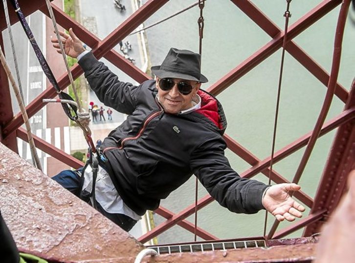 Con una cuidada puesta en escena aunque con los lógicos contratiempos por los rigores de las medidas de seguridad que requería técnicamente el evento, la banda presentó ayer su nuevo trabajo y gira para sorpresa de los transeúntes. Amante de la escalada, Francis volvió a las alturas para descender desde lo más alto del puente en compañía de una pancarta promocional del grupo. Todo un simbolismo que reflejaba la génesis de esta nueva entrega. «Yo os bajaría a todos por ahí. Desde ahí arriba –aseguraba–. Porque es una mirada distinta. Para alguien que le gusta la escalada, esto es la hostia». Y su rostro de satisfacción así lo atestiguaba.