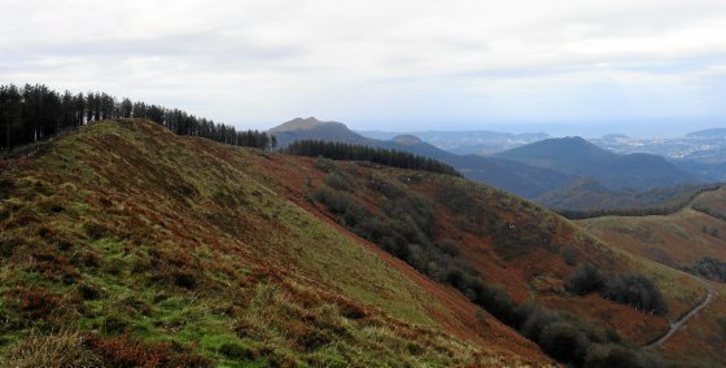 Unos metros adelante, aromatizados por los eucaliptos, desechamos desvíos a izda. y dcha., afrontando la pista ascendente, en esta margen derecha de la ladera. Al poco, asoma la primera cima, rocosa y accesible, siguiendo la pista principal que enseguida se convierte en sendero. El tramo final supone dejar a dcha. otro sendero, de tal manera que alcancemos el cordal y la cima rocosa, con mugarri de Hernani y Arano incluido.