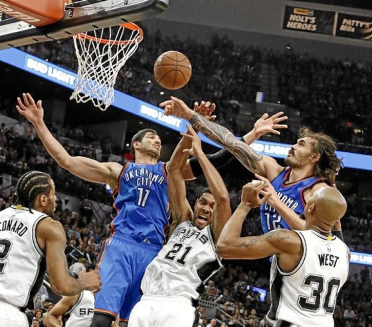 El pívot neozelandés Steven Adams se está convirtiendo en un factor desequilibrante a favor de los Thunder, ya que con 12 puntos y, sobre todo, 11 rechaces, impide las segundas opciones a los de Popovich, amén de que está frenando a Duncan.