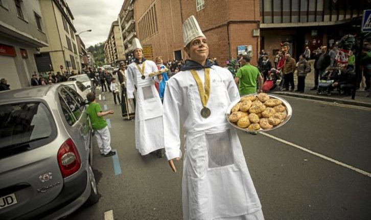 «Hace tres años hicimos a los hermanos Elhuyar –descubridores del Wolframio– para que los niños sepan la historia de Bergara. Siguiendo ese patrón se nos ocurrió que en la villa son muy famosos los dulces tostones y relleno. Así que pensamos hacer un guiño a eso y dedicárselos a los pasteleros», contó Ibon Unamuno, miembro de la comparsa de gigantes.