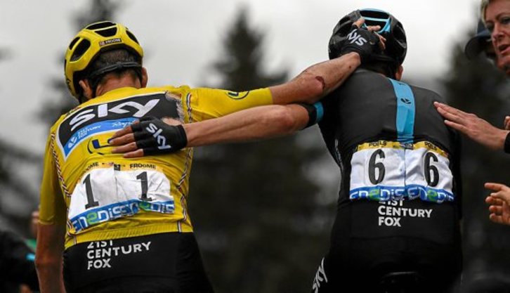 Magullado, y con hielo en su rodilla en el podio, el británico de Nairobi sufrió en los últimos kilómetros de ayer más que en todo el Tour. Por eso quiso agradecer a sus compañeros el trabajo realizado; por eso abrazaba a Wouter Poels nada más cruzar la meta. «Tengo la suerte de tener compañeros de equipo geniales, como Thomas, que me ha prestado su bici», reconocía.