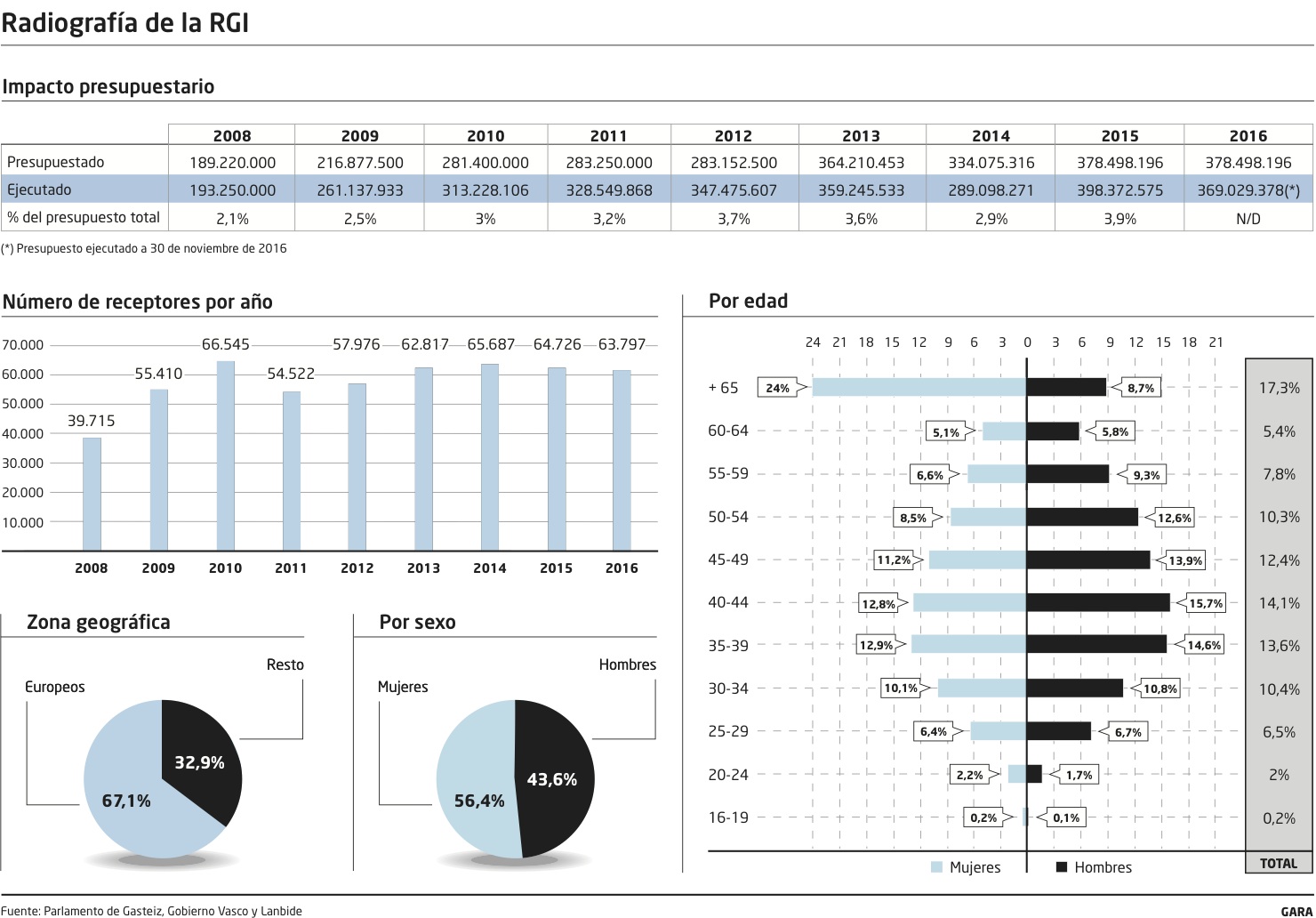 A los trabajos académicos que han refutado infinidad de veces el argumento según el cual, reconociendo excepciones, la mayoría de ciudadanos prefiere vivir con unos 700 euros al mes que trabajar, cabe sumar la propia información de la que se dispone sobre los receptores de la RGI. A la espera del informe anunciado por el Gobierno para este primer semestre del año, cabe destacar que, según las informaciones publicadas estos días, los receptores de la RGI se cronifican sobre todo a partir de los 55 años de edad, lo que ahuyenta el fantasma del parasitismo generalizado. El problema no es la ayuda, sino la dificultad de acceso al mercado laboral para ciertos perfiles. Esta última idea viene reforzada por los datos disponibles sobre receptores, que muestran que la franja de edad con mayor número de receptores (el 17,3%) es el de los mayores de 65 años. Ya lo dijo Urkullu: no se trata trabajo, se trata de lucha contra la pobreza.