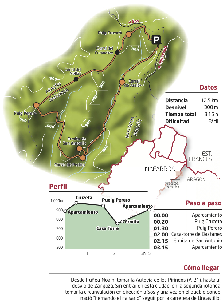 Los primeros pasos los haremos por la carretera en dirección a Sos, hasta la altura del desvío a la derecha de una pista de grava que lleva a Petilla, cinco minutos más tarde. Por la izquierda, una borrosa pista nos llevara por el flanco de un cordal entre campos de cereal, encinas y robles pubescentes al corral de Puiladrones, situado en el borde del campo. Poco después estaremos junto la cumbre de Puig Cruceta (952 m.), desde donde veremos al final del cordal el Puig Perero. Las vistas se abren hacia las sierras de Sos y Peña y montes de Uncastillo y Castilliscar. El recorrido mantiene la altura de un cordal de suaves lomas que establecen los límites de Nafarroa con Aragón. En algunos tramos seguiremos por una pista de tierra proveniente de la carretera de Sos, dejando al paso los corrales del Curandero, seguido de un desvío que baja al corral de Vitorino, para una vez sobrepasado el corral de Mellao, abandonar finalmente la pista para alcanzar el Puig Perero (928 metros).