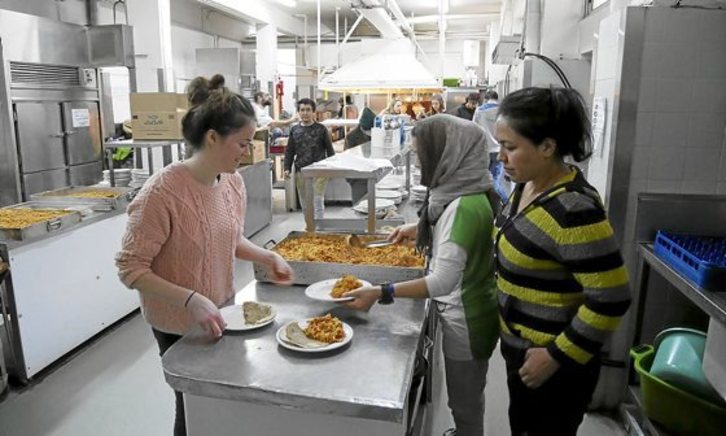 400 lagunentzako otorduak egiteko, hoteleko sukaldea eta jantokia baliatzen dituzte, eta jatorri ezberdinetako lagunentzat egokitutako bazkari eta afari bereziak prestatzea izaten da sukaldarien asmoa. Eta lortzen dute. Errefuxiatuak jatorri ezberdinetakoak izanik, zapore berriak ezagutzeko aukera paregabea ere izaten da. Elikagaien biltegian denetarik eta neurri handian dago: sasoiko produktu freskoak eta frutak, mila eratara prestatzen diren arroz eta kuskusa, lekale mordoa, batetik edo bestetik heldutako indaba, garbantzu eta dilistak. Hamaika zapore ezberdin sortzen dituzten hauts eta espeziak, eta, batez ere, borondate gozo eta atsegina. Horrek guztiak sukaldean giro itzela sortzen du, eta irribarrez eta atseginez jasotzen dute eguneroko menua City Plazan ostatu hartutako errefuxiatuek.