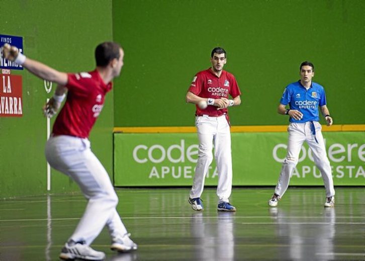 Ya desde la elección de material ambas duplas habían mostrado sus intenciones de plantear un partido serio, de desgaste, en el que no asumir demasiados riesgos; en definitiva, un duelo de esos que se llama de campeonato, sucede que ese planteamiento solo duró una docena de tantos, exactamente hasta el empate a seis, el último de todo el partido en Tafalla.