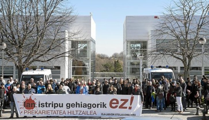 “Lan istripu gehiagorik ez. Prekarietatea hiltzailea!” era el lema de la pancarta desplegada por los sindicatos, que hacían referencia así a las últimas muertes laborales registradas en Euskal Herria y a que «la subcontratación supone precariedad, siendo ésta la razón principal de la siniestralidad laboral».