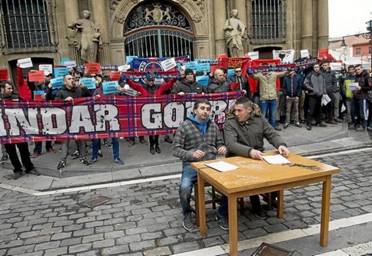 «Somos osasunistas incondicionales sin importar la categoría, además de abertzales y antifascistas, que recogen el testigo dejado por Eladio Zilbeti y otros tantos navarros y navarras que fueron forjando una historia, unos colores, una pasión y una seña identitaria a la que se debe defender por encima de trepas, corruptos, golpistas y cuneteros», reflejaron en una nota leída en euskara y castellano.