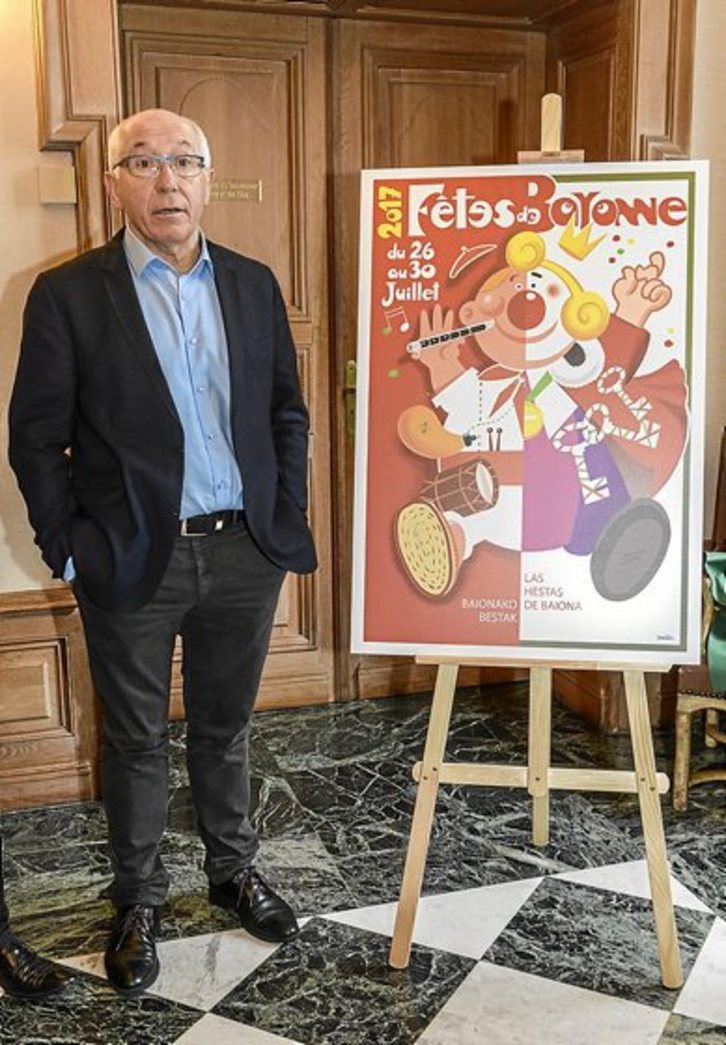 El ganador del cartel de las fiestas de Baiona, que se dio a conocer ayer, es el diseñador Jean Duverdier. Creador del Rey León, ha fusionado al emblemático personaje con un festazale para idear la imagen ganadora. Duverdier ha recibido el 36,79% de los votos populares en su disputa con otros cuatro concursantes. En la imagen, el alcalde Jean-René Etchegaray junto al cartel vencedor.