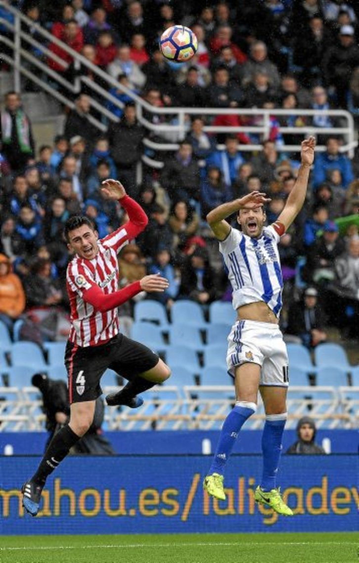 El Athletic logró que el partido discurriera por el camino que le interesaba sin que la Real consiguiera imponer su juego y controlar la posesión como le gusta. El conjunto rojiblanco no necesitó de una presión tan adelantada como la que le dio la victoria en San Mamés, rara vez Beñat acompañaba a Raúl García y Williams en la presión a los centrales realistas para impedir que conectaran con Illarramendi, pero la Real salía mentalizada a no asumir riesgos como entonces y abusó en la primera media hora del juego directo que le conviene al Athletic para imponer su superioridad física en un partido de ida y vuelta sin control.
