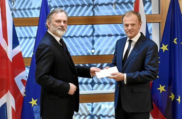 El divorcio ya está en marcha. Puntual, a las 13.20 (hora de Euskadi), el embajador de Gran Bretaña para la Unión Europea, Tim Barrow, entregó la carta que contenía la notificación de Theresa May sobre la activación del artículo 50 del Tratado de Lisboa. Seis páginas de documento que viajaron hasta Bruselas en el tren Eurostar entre importantes medidas de seguridad. La imagen del presidente del Consejo Europeo, Donald Tusk, recibiendo el sobre de manos del representante británico quedará para la Historia, así como el propio contenido de la carta.