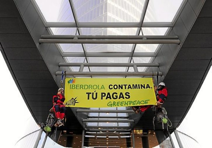 Greenpeace llevó a cabo ayer una protesta contra algunas de las empresas del Estado español que más contaminación generan. Varios activistas del grupo ecologista denunciaron con globos negros la contaminación en las sedes de Iberdrola en Bilbo, Endesa en Madrid y Gas Natural en Barcelona.