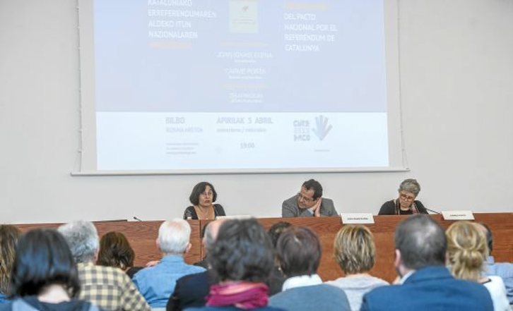 DOS REPRESENTANTES DEL PACTO NACIONAL POR EL REFERÉNDUM VISITAN ENTRE AYER Y HOY EUSKAL HERRIA PARA DAR A CONOCER ESTA PLATAFORMA DIVERSA Y TRANSVERSAL QUE AÚNA A LOS DEFENSORES DEL PLEBISCITO CATALÁN. AYER SE EXPLICARON EN BILBO INVITADOS POR GURE ESKU DAGO.