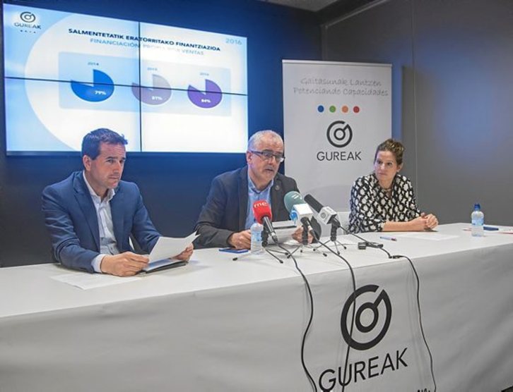 La empresa de economía social guipuzcoana Gureak, que emplea a personas con discapacidad, incrementó sus ventas en un 12% en 2016, año en el que logró su cota más alta de financiación propia por este concepto, que alcanzó la cifra del 84%. El director general de la compañía, Iñigo Oyarzabal; la directora de Gureak Itinerary, Ainhoa Askasibar; y el responsable del área industrial, Asier Vitoria, informaron ayer en una rueda de prensa de los resultados del último ejercicio cerrado.