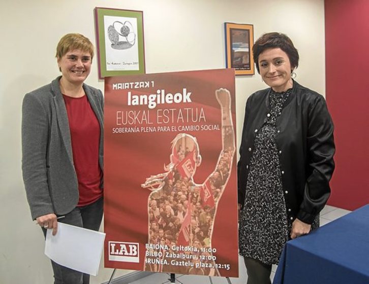 En la rueda de prensa que tuvo lugar en la sede del sindicato en Donostia, en la que estuvo acompañada de Garbiñe Aranburu –candidata a relevarla en el cargo en el congreso de mayo–, Etxaide dio cuenta de la lectura que LAB hace de este Primero de Mayo, para el que ha convocado sendas manifestaciones en Baiona, Bilbo e Iruñea, bajo el lema “Langileok, Euskal Estatua. Soberanía plena para el cambio social”. Un mensaje y unas movilizaciones que quieren servir de freno al «fraude político» que, a juicio del sindicato, se quiere llevar a cabo.