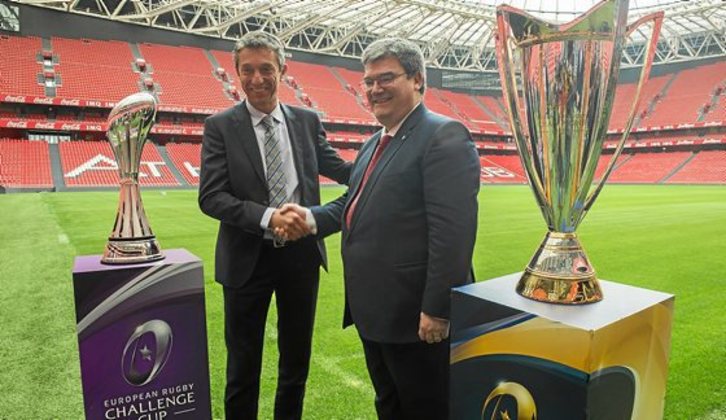San Mamés mostró ayer los dos trofeos que estarán en juego en las finales europeas de rug-by –Champions y Challenge– que se disputarán en este campo los días 11 y 12 de mayo del próximo año y que se espera traigan a Euskal Herria a más de 100.000 visitantes. En la imagen, el director general del European Professional Club Rug- by –organismo responsable de las competiciones continentales–, Vicent Gaillard, y el alcalde de Bilbo, Juan Mari Aburto, junto a las dos copas en La Catedral.Monika DEL VALLE | ARGAZKI PRESS