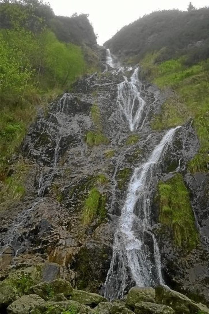 Poco a poco el sendero alcanza el nivel del río. Se cruza a la otra orilla, margen izda, por un puente, y desde donde ya retumba el ruido de las aguas de la cascada que está cercana. Ahora el montañero deberá superar una rampa, que antaño era incómoda, pero hoy está catalogada, intervenida y habilitada con un cómodo zigzag, escaleras y pasamanos con cable a modo de un barandado, que en disfrute deportivo alcanza una pista con nuevas señaléticas. La montaña no ofrece, al estar tan urbanizada, duda alguna al aficionado que hasta allí ha llegado. Siguiéndola se alcanza la captación de aguas, con su boca túnel para la central y las ruinas de Karburoko etxea. Es un lugar con mucho encanto, donde circulan caudalosas, cantarinas y saltarinas aguas. Ahora, para observar bien la cascada y la poza donde vierte su agua, hay que cruzar el arroyo, con prudencia si hay mucha circulación y desde allí remontar la ladera a la dcha por un indefinido sendero hasta encontrar el mirador. Aquí decidirá el deportista si se acerca aún más hasta la base o inicia el retorno hasta la pista recuperada y balizada para que nadie se pierda, que utilizará para regresar por recorrido diferente. Cruzará unas anchas tuberías y por los caseríos de Ibarla, cómodamente, alcanzará el punto de inicio de esta corta pero soberbia sugerencia.