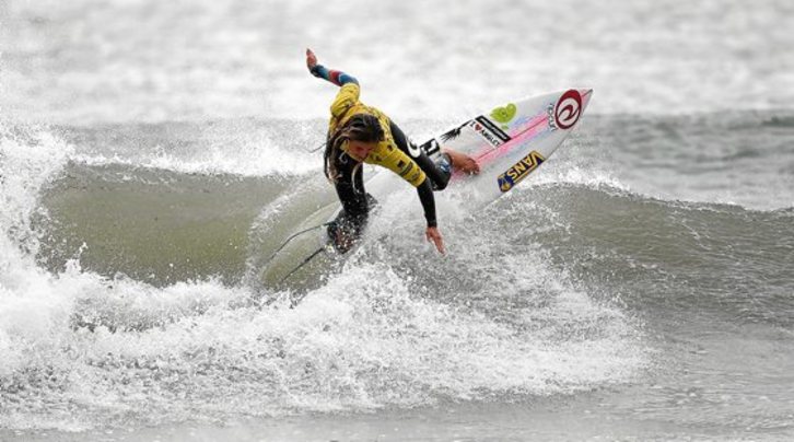 Pauline Ado hendaiarrak urrezko domina jantzi zuen atzo Biarritzen, ISAk (International Surfing Assotiation) antolatutako herrialdeen arteko munduko txapelketan. 12,17 puntu batuta, 26 urteko surflariak Jehane Defay frantziarra (10,43 puntu) eta Leilani McGonagle costarricarra (8,4) utzi zituen atzean; finalean aritu zen Bianca Buitendang hegoafrikarra ere, baina 7,47rekin podiumetik at geratu zen. Argazkian, Ado, probaren hirugarren errondan.Franck FIFE | AFP PHOTO