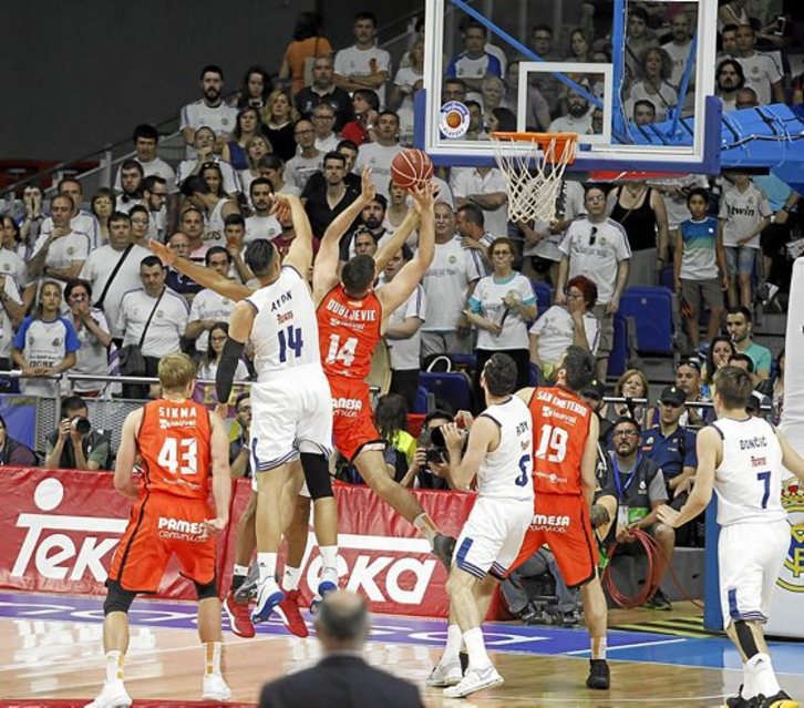 Valencia Basket se saltó el guión de la final de la Liga ACB Endesa. En la temporada 2002/03, el Pamesa Valencia de los Oberto, Tomasevic, Montecchia, Kammerichs o Bernard Hopkins cayó por 3-0 en la finalísima ante un Barça que aquel añó hizo triplete: Copa, Liga ACB y Euroliga. Ayer, por ende, la escuadra taronja dio un paso más camino de ingresar en la élite: ganó al Real Madrid en Madrid y puso el factor cancha en sus manos. Los de Pedro Martínez salieron en tromba, pero sobre todo supieron sufrir cuando los merengues se adelantaron 64-59. Y de la mano de Diot y un extraordinario Dubljevic establecieron el 1-1 en una final muy divertida.