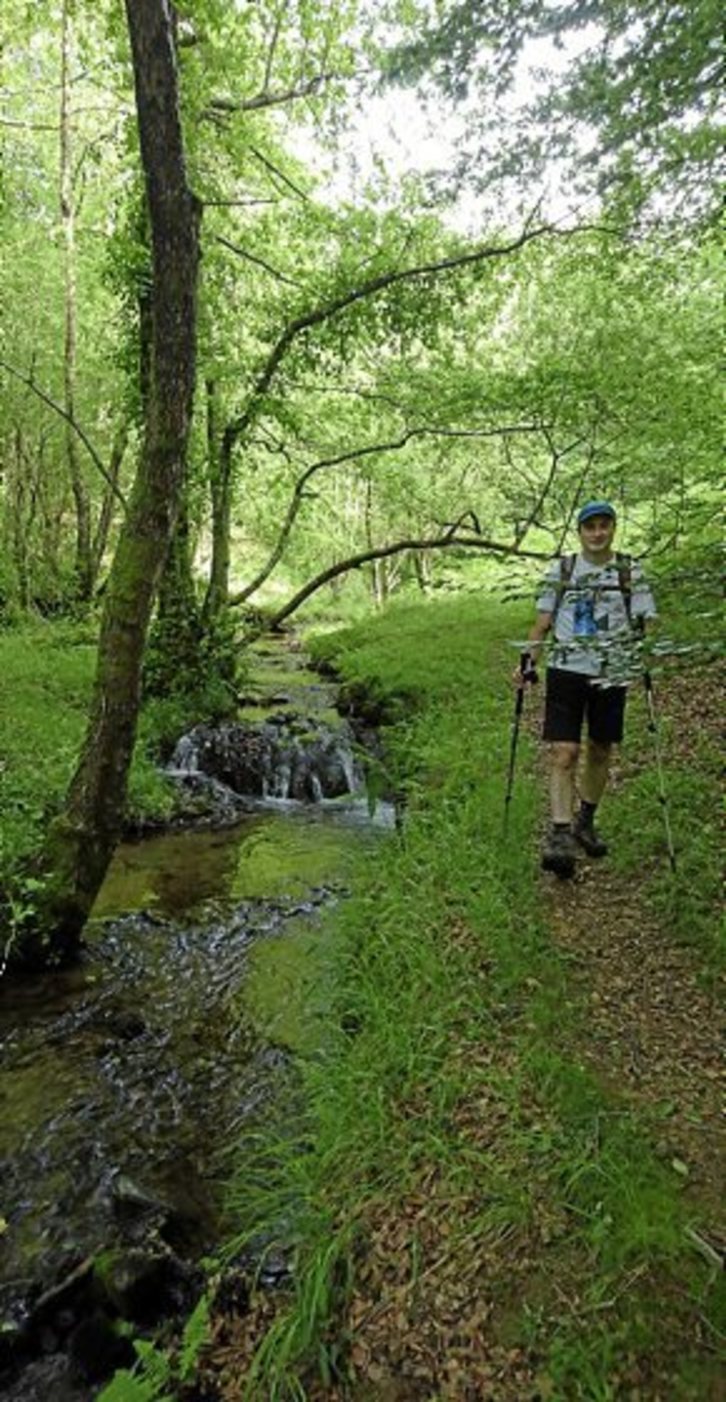 Allí haremos dos giros a la izda., antes y después de una valla de madera. Ello nos permite introducirnos en el bosque, con cobertizo interior que atravesamos, y sobre el camino con valla a la derecha, para atravesar un prado tras el que decidimos. “De perdidos al río”. Es Ondarluzeko erreka la elegida para nuestro particular “descenso del Urumea”. Al poco, un lindo sendero acompaña a la erreka con bellos micropaisajes, que con el paso, ganan en caudal, con la llegada de nuevas aguas.