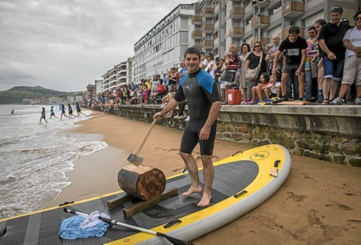 Bizi osoa surf egiten pasatu ostean bere lehengusu bati sorpresa bat ematearren aizkoran hasi zen 37 urteko zarauztarrak nahikoa lan badu gehien maite dituen bi kirolak uztartzen, baina denera iristen da, eta pasatzen den leku bakoitzean lorratza uzten du. Batean zein bestean, gehien miresten dituen kirolariak ditu lagun eta horregatik zorioneko sentitzen da. Badu zer kontatu surflari/aizkolari honek.