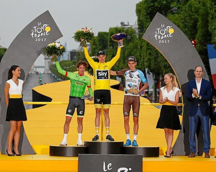 Junto a Froome, Urán y Bardet pisaron el podio ayer Michael Matthews como ganador del maillot verde y Warren Barguil para recibir el de la montaña y el premio a la combatividad. Sky subió como ganador por equipos y Thomas Voeckler para despedirse del ciclismo en la carrera que le hizo protagonista.