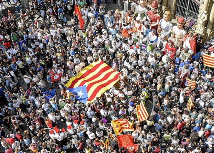 Cuatro comparsas de gigantes se apiñaron ayer junto a las puertas del Ayuntamiento. Querían sacarse la foto con una estelada y saludar así a los catalanes que pelean en las calles por su independencia. La foto no llegó a quedar redonda, pues se congregó tanta gente que la multitud se comió a los fotógrafos y estos quedaron en medio de la concentración, incapaces de retratarla entera. El ruido de bombos y de txarangas callejeras acalló el sonido de unos gaiteros que tocaban “L’Estaca” de Lluís Llach desde el portalón municipal. Ya desde la mitad de plaza, el ruido era confuso pues se mezclaban demasiadas melodías a la vez. Algunos se arrancaron con un «¡Votarem!» y luego se impuso el tradicional grito de «Independentzia». Cuando acabó el acto de la dinámica AsCATasunera, miembros de las distintas comparsas tuvieron que abrir paso entre gritos para que sus gigantes pudieran continuar callejeando por la ciudad.