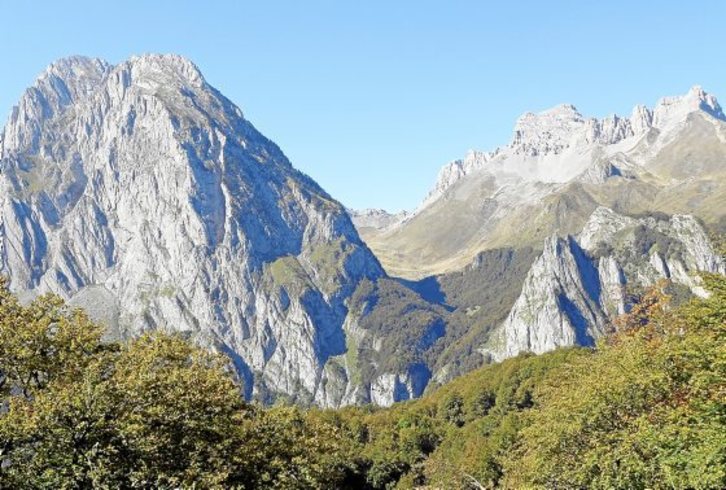 Este resalte situado bajo el farallón calizo domina unas inclinadas laderas cubiertas de bosques con una infinita gama de colores.