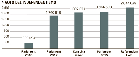 Cabe destacar que, en contra de lo que se dice, el independentismo no ha dejado de crecer tras el estirón que registró en 2012, cuando CiU incorporó el Estado propio al programa electoral. Desde entonces ha seguido al alza, aunque mucho más lentamente. El reto para el 21D es lograr que los que dijeron Sí el 1-O voten a alguna lista independentista. Serán necesarios todos ellos y alguno más para ganar también en votos, lo que significaría un vuelco considerable de la situación. Con una participación como la de 2015, los 2.044.038 votos del 1-O se habrían quedado en un 49,5% de los votos.