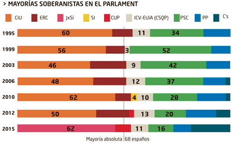 La infografía también deja de manifiesto por dónde pasan las mayorías alternativas, que se construyeron en 2003 y 2006 con ICV de bisagra (Tripartit). Las encuestas auguran que los números podrían darse de nuevo, pero nunca sin el PSC, y teniendo en cuenta la aparición de un nuevo actor, la CUP, que no dará apoyo a un ejecutivo en el que estén los socialistas. El escenario es abierto, pero cualquier mayoría que no sea independentista será muy difícil de articular.