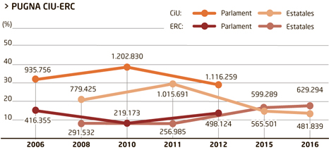 La lucha por el liderazgo en el seno del bloque independentista (igual que en el unionista) es una de las derivadas más importantes del 21D. Las encuestas llevan años augurando el «sorpasso» de Esquerra a Convergència en el Parlament, pero la jugada de Artur Mas en 2015, cuando forzó a Oriol Junqueras a concurrir en Junts pel Sí, pospuso ese histórico cambio. La tendencia, en cualquier caso, quedó clara en las elecciones al Parlament y cristalizó en las dos elecciones estatales celebradas en diciembre de 2015 y junio de 2016. En la primera cita ERC materializó el «sorpasso» por poco, pero seis meses más tarde confirmó el cambio con una diferencia de casi 150.000 votos.