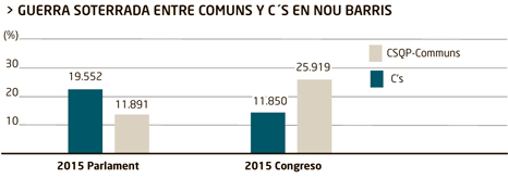 Los Comuns y Ciudadanos son antagónicos en muchos aspectos; también son muy diferentes la mayoría de sus votantes. Sin embargo, la sangría de votos del PSC es una fuente de la que ambos beben. Dependiendo de las circunstancias, ese voto se puede decantar por el tándem Rivera-Arrimadas o por el de Colau-Domènech. Será interesante observar qué ocurre en las periferias de las áreas metropolitanas. Sirvan como ejemplo los datos de Nou Barris, el distrito de menor renta de Barcelona. El 27 de setiembre de 2015, en elecciones al Parlament, se impuso C’s. Menos de tres meses después, el 20 de diciembre, los resultados se invirtieron del todo.