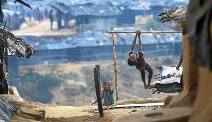 Egoera gogorretan ere, haurra haurra da eta beti saiatuko da bilatzen –eta batzuetan topatuko du– jolaserako aukerarik txikiena. Ez du askorik behar izaten, are gutxiago askorik ez duenean. Argazkiko honek non kulunkatu eta buruz behera jarri aurkitu du, eta irri ederra erakutsi dio argazkilariari. Kutupalong errefuxiatu-eremua (Bangladeshen) du orain bizileku, Myanmarreko Armadari ihes egin ostean, beste milaka rohingyak bezalaxe.Munir UZ ZAMAN | AFP PHOTO