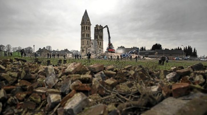La iglesia San Lambertus de Immerath –aldea de la ciudad de Erkelenz, oeste de Alemania– y sus 120 años de historia fueron demolidas ayer a pesar de las protestas de vecinos, previamente reubicados, y de Greenpeace. El derribo se debe a que bajo el templo existen depósitos de uno de los combustibles más sucios de Europa, el lignito, y a que las autoridades han dado luz verde a la explotación en el área de una gran mina de carbón a cielo abierto.Federico GAMBARINI | AFP